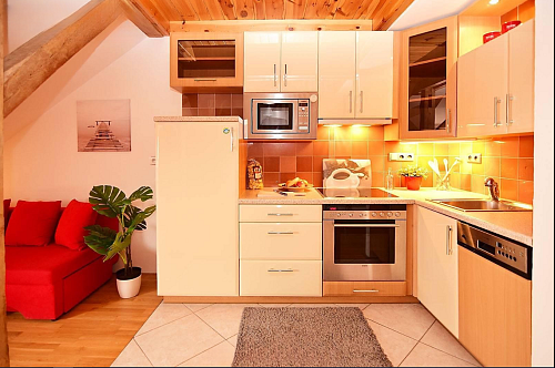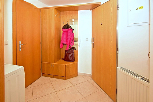 Byt je umístěný v posledním 6.patře a je rozvržený do dvou pater. V přízemí je předsíň s vestavnou šatní stěnou na míru, koupelna s vířivou vanou, umyvadlem a toaletou, vzdušný obývací pokoj s kuchyňským koutem a úložnými skříňkami. Kuchyň je vybavena vestavnými spotřebiči zn. Siemens (lednice s mrazničkou, sklokeramická deska s horkovzdušnou troubou, myčka, mikrovlnná trouba a digestoř).