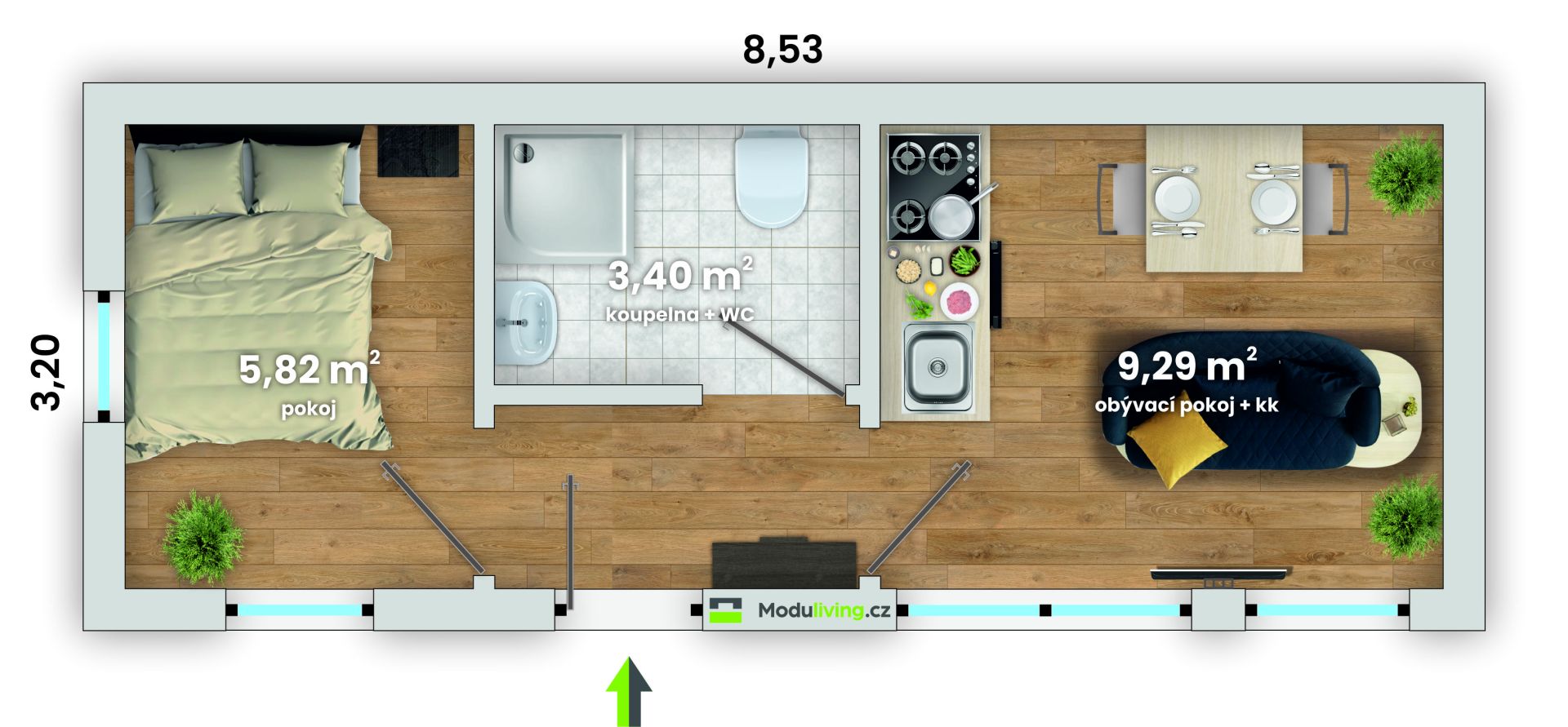 rozměry domu 8,53 m x 3,20 m