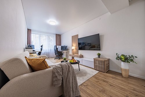 V bytě jsou vestavěné skříně, nové podlahy v obývacím pokoji a ložnici, vinylová podlaha v kuchyni a předsíni, protihluková stěna v obývacím pokoji a nové podhledy. Částečně jsou také nové rozvody elektřiny. Koupelna a toaleta jsou vybaveny dlažbou a obklady.